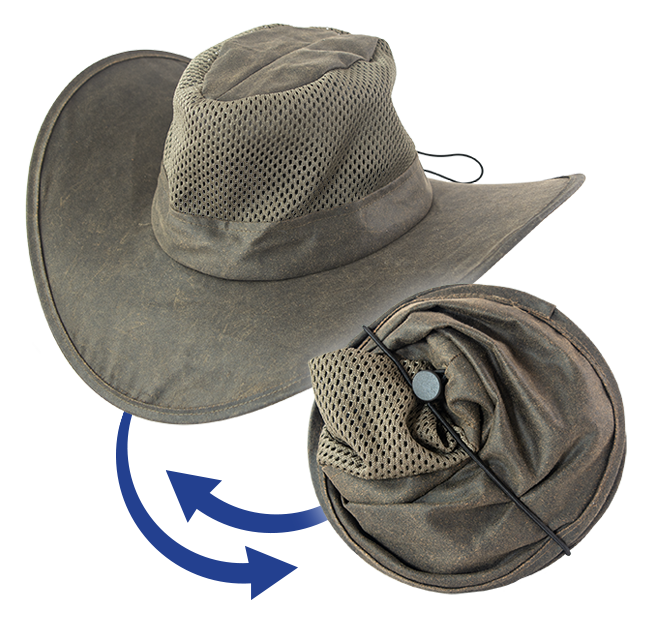 The Pop Hat® uses a patent-pending folding system that allows the brim to collapse flat for packing, then instantly return to full shape when opened.
